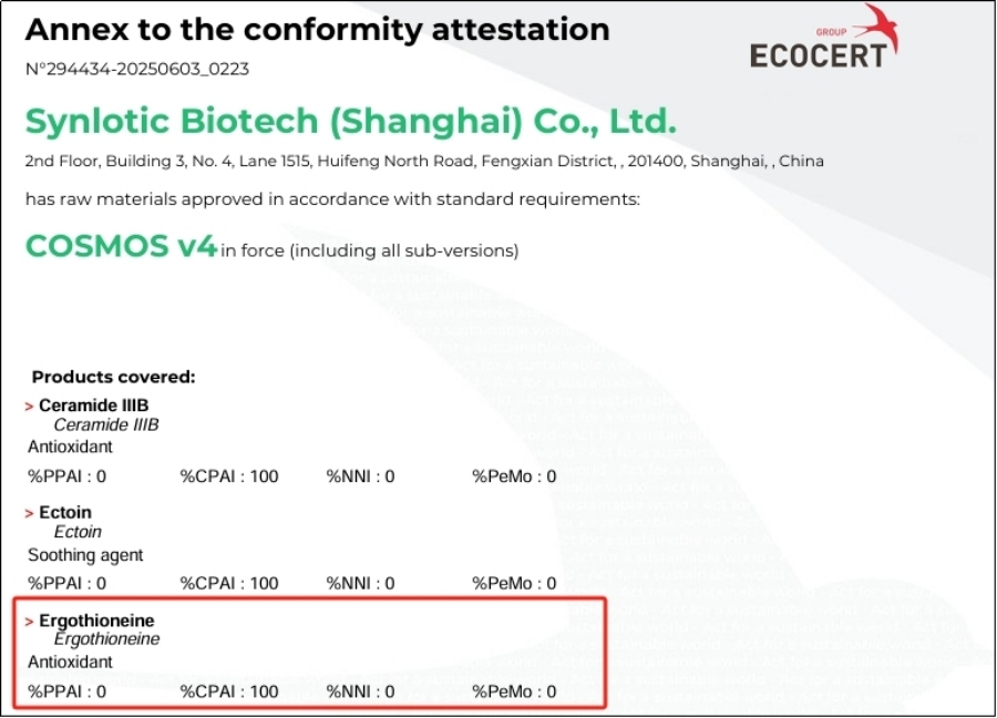 မကြာသေးမီက Shanghai Yunluo မှထုတ်လုပ်သော Eranghai Yunluo မှထုတ်လုပ်သော Eranghai Yunluo မှထုတ်လုပ်သော EU Cosmos သဘာဝအသိအမှတ်ပြုလက်မှတ်ကိုပြင်သစ်နိုင်ငံရှိ EuCocert မှခွင့်ပြုထားသည်။